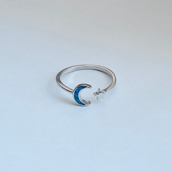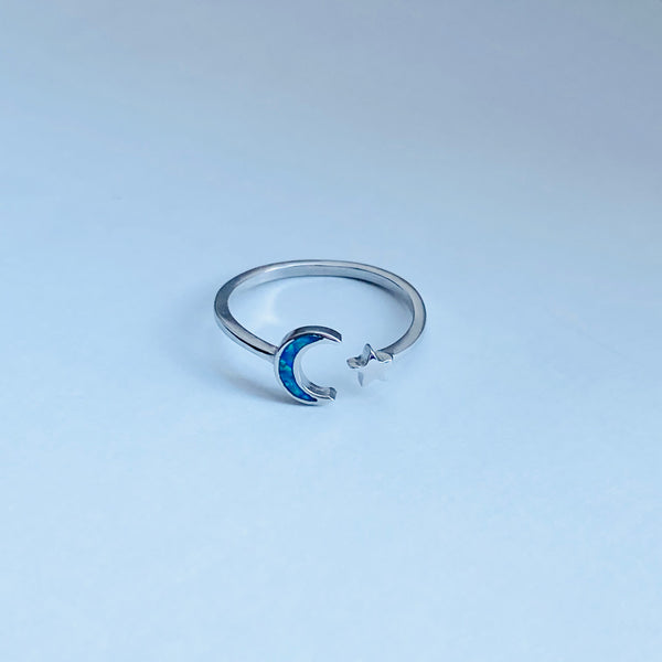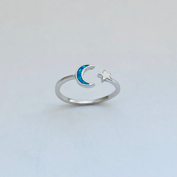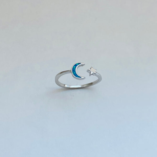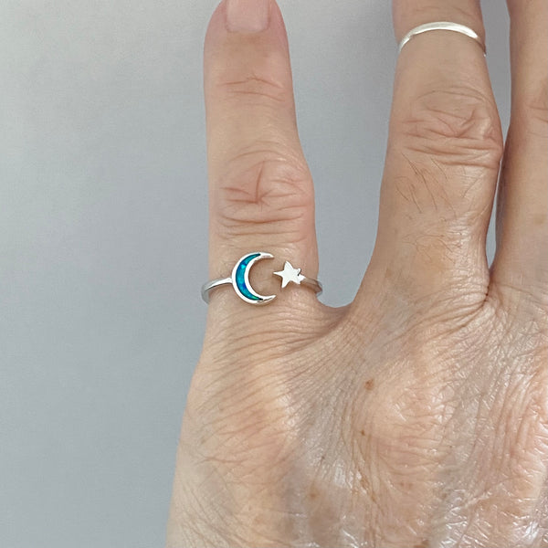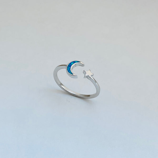 Sterling silver blue lab opal moon and star ring, midi ring, pinky ring, knuckle ring, index ring, thumb ring, silver ring, simple ring, sky ring, 925 stamped