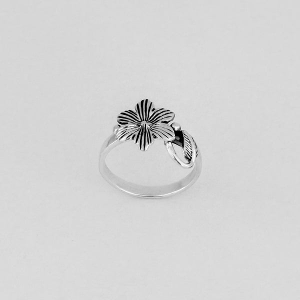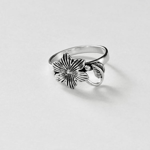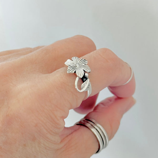 Sterling silver plumeria flower ring with one leaf, silver rings, hawaii flowers, 925 stamped