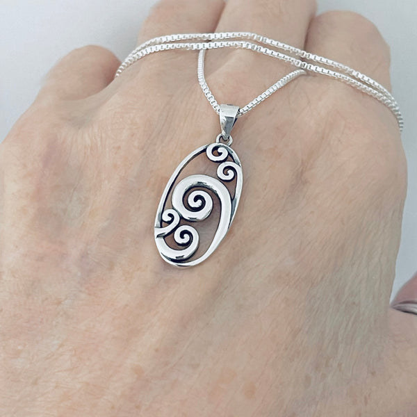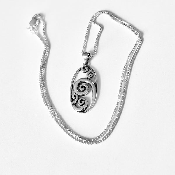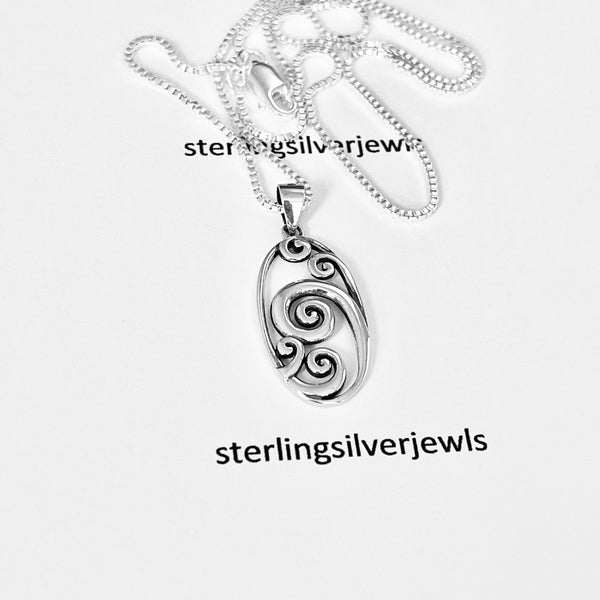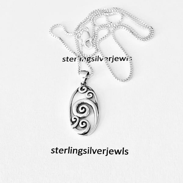 Sterling silver large oval waves pendant with Italian silver box chain necklace, ocean pendant, surf necklace, beach necklace, spiral necklace, 925 stamped